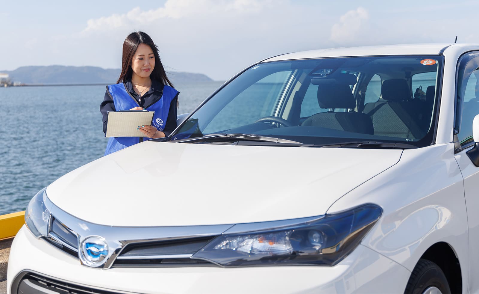 店舗に到着したら、スタッフへ担当車両を伝えます。